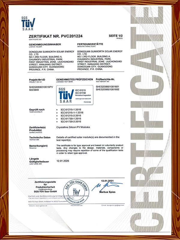 Sunworth holds ISO9001, ISO 14001, and ISO45001 certifications, ensuring adherence to rigorous quality, environmental, and occupational health and safety standards. Moreover, a range of Sunworth’s products have obtained certifications such as TuV, CE, CB, and ROHS, guaranteeing their compliance with industry regulations and standards. Committed to the vision of sustainable solar energy provision, Sunworth will persistently contribute to the global renewable power revolution, continuing its dedication to the solar industry and the advancement of solar energy worldwide.